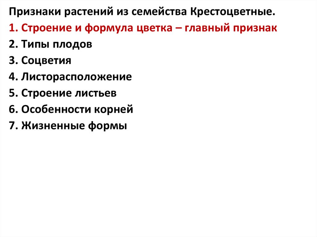 Признаки растений из семейства Крестоцветные.1. Строение и формула цветка – главный признак