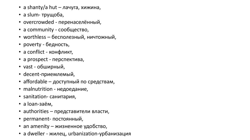• a shanty/a hut – лачуга, хижина,• a slum- трущоба,