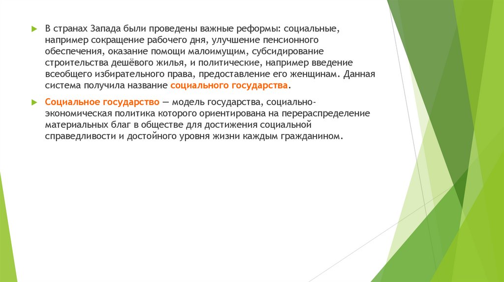 В странах Запада были проведены важные реформы: социальные,например сокращение рабочего дня, улучшение пенсионного