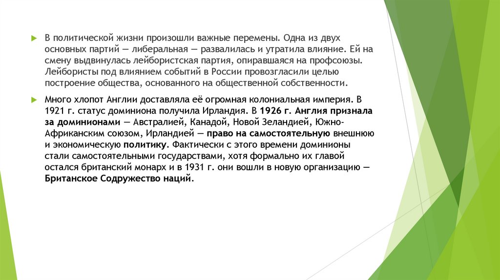 1921 г. статус доминиона получила Ирландия. В 1926 г. Англия признала