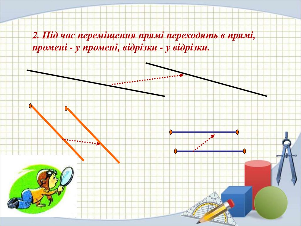 2. Під час переміщення прямі переходять в прямі,промені - у промені, відрізки - у відрізки.