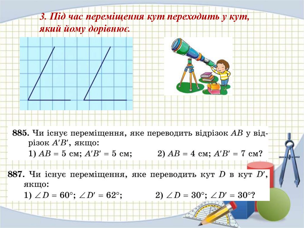 3. Під час переміщення кут переходить у кут,який йому дорівнює.