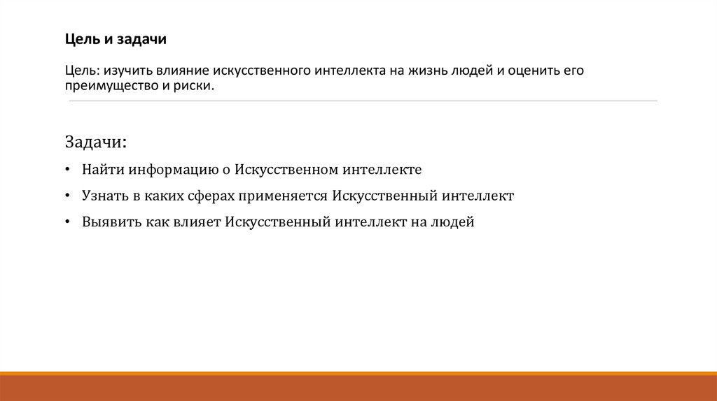 Цель и задачиЦель: изучить влияние искусственного интеллекта на жизнь людей и оценить его