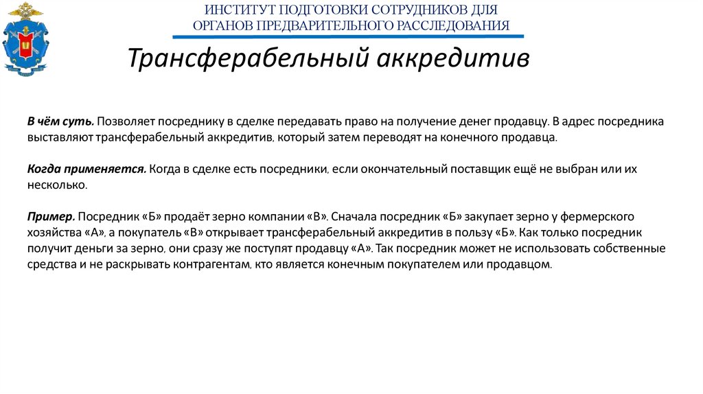 хозяйства «А», а покупатель «В» открывает трансферабельный аккредитив в пользу «Б». Как только посредник