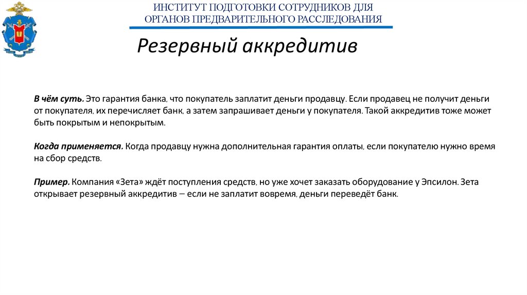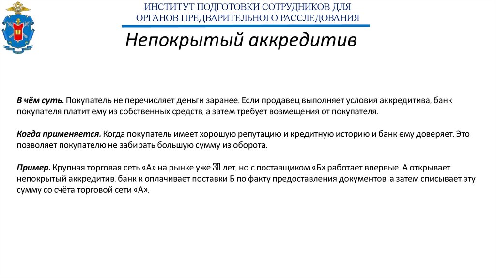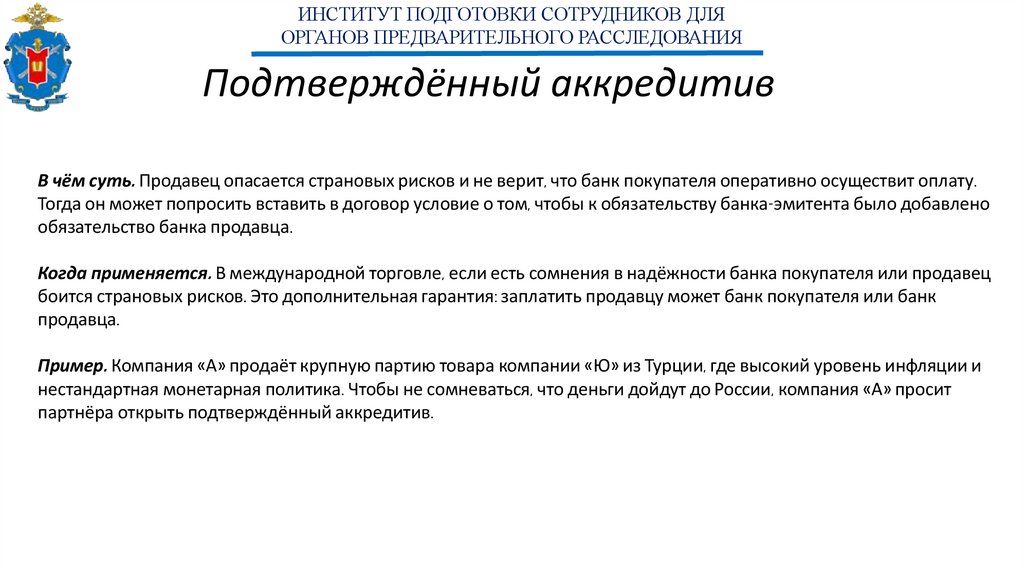 Когда применяется. В международной торговле, если есть сомнения в надёжности банка покупателя или продавец