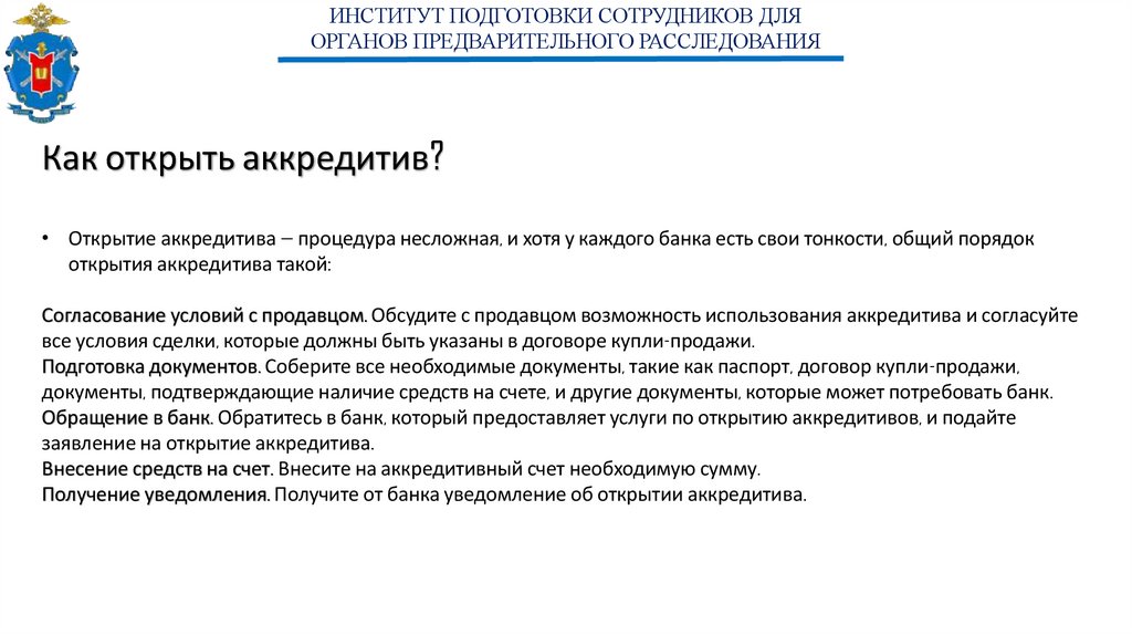 • Открытие аккредитива — процедура несложная, и хотя у каждого банка есть свои тонкости, общий порядок