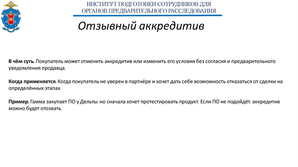 Пример. Гамма закупает ПО у Дельты, но сначала хочет протестировать продукт. Если ПО не подойдёт, аккредитив