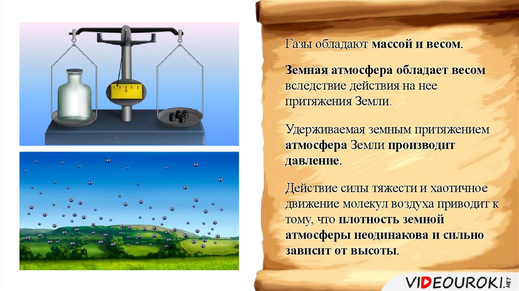 Газы обладают массой и весом.Земная атмосфера обладает весом