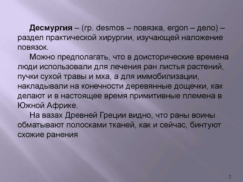 Десмургия – (гр. desmos – повязка, ergon – дело) –раздел практической хирургии, изучающей наложение