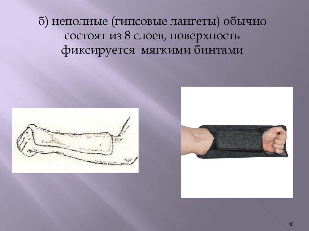 б) неполные (гипсовые лангеты) обычносостоят из 8 слоев, поверхность
