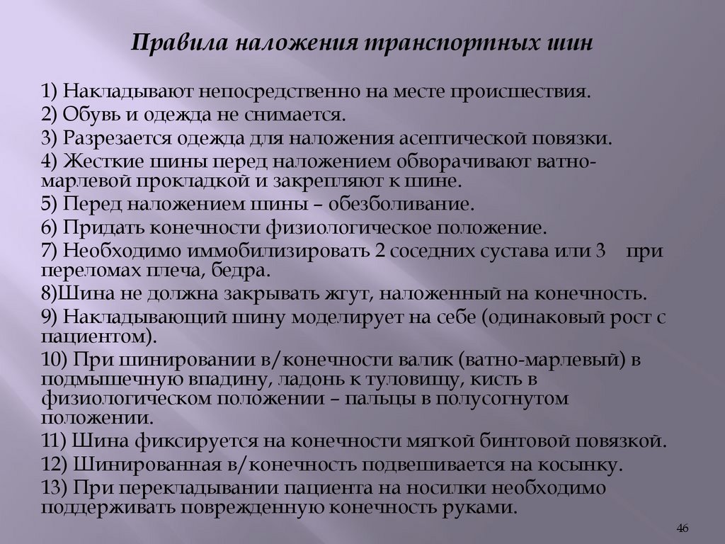 Правила наложения транспортных шин1) Накладывают непосредственно на месте происшествия.