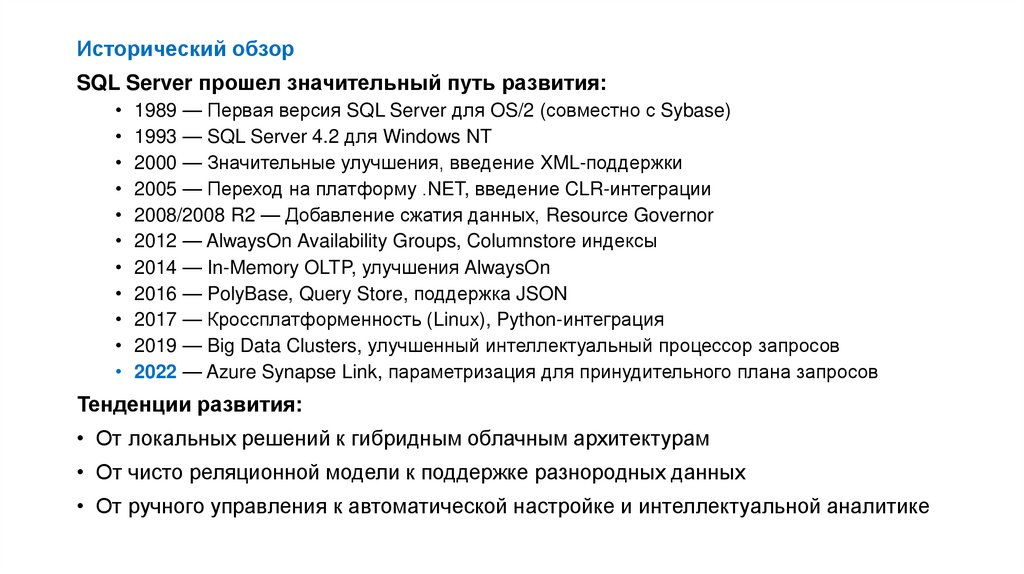 Исторический обзорSQL Server прошел значительный путь развития: