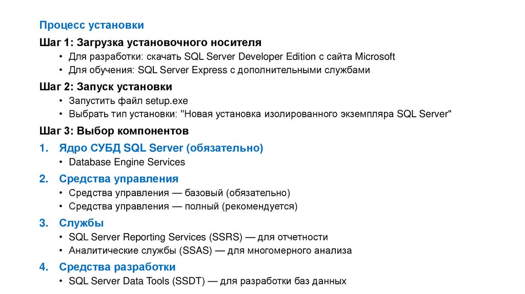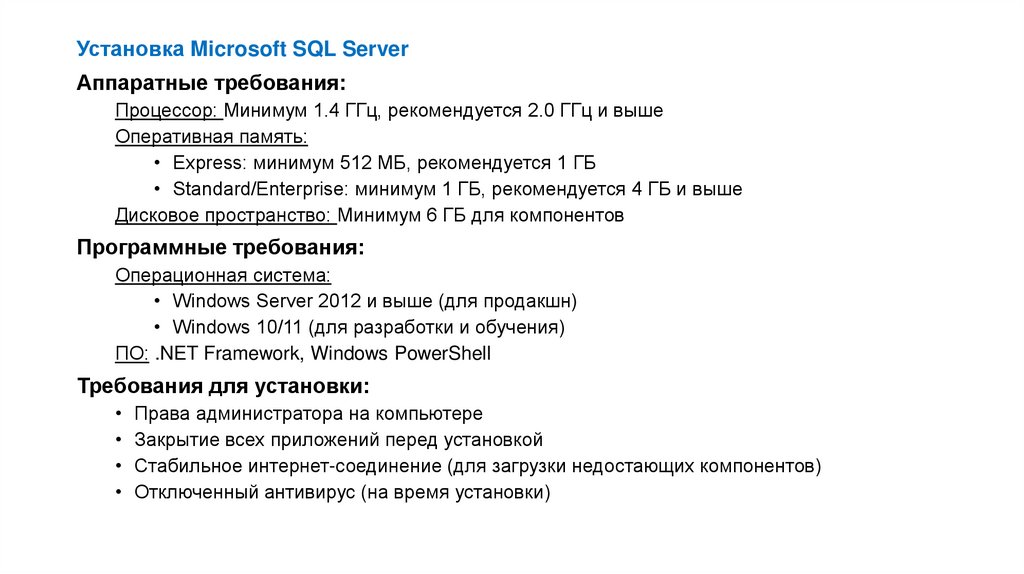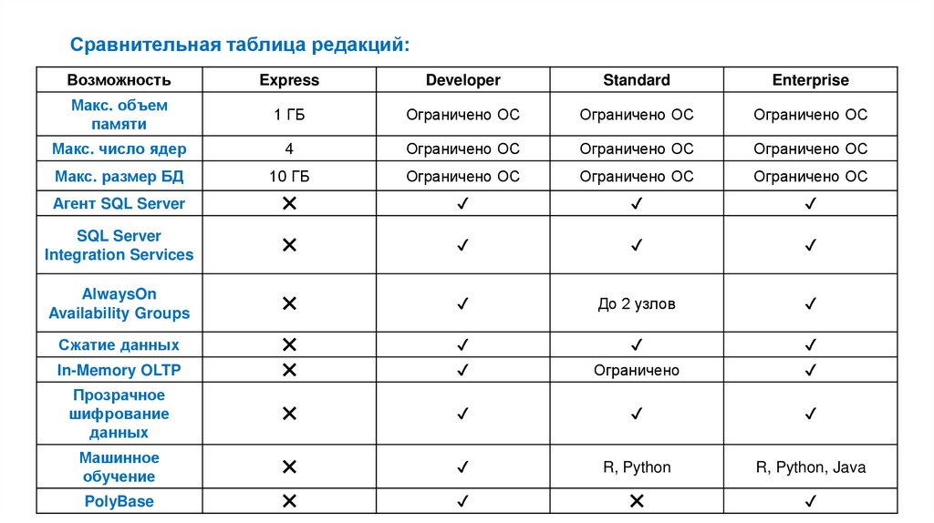 • Отсутствуют агент SQL Server, службы Integration Services (только базовые)