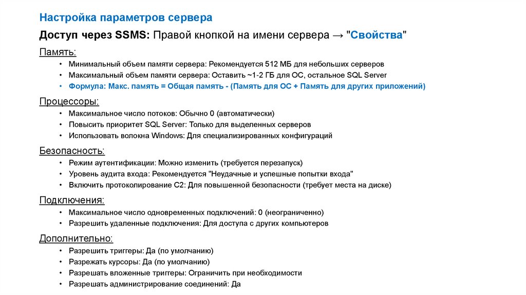 Настройка параметров сервераДоступ через SSMS: Правой кнопкой на имени сервера → "Свойства"