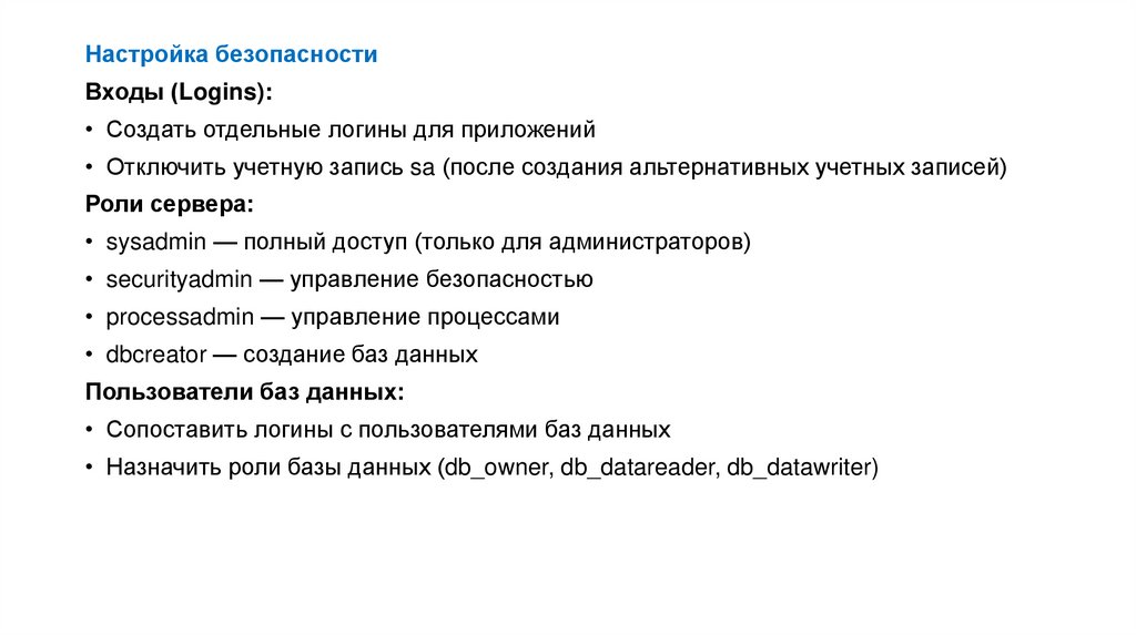 • Отключить учетную запись sa (после создания альтернативных учетных записей)