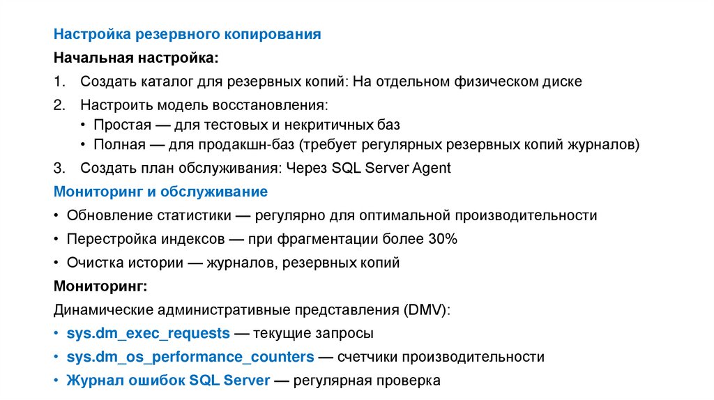 • Полная — для продакшн-баз (требует регулярных резервных копий журналов)