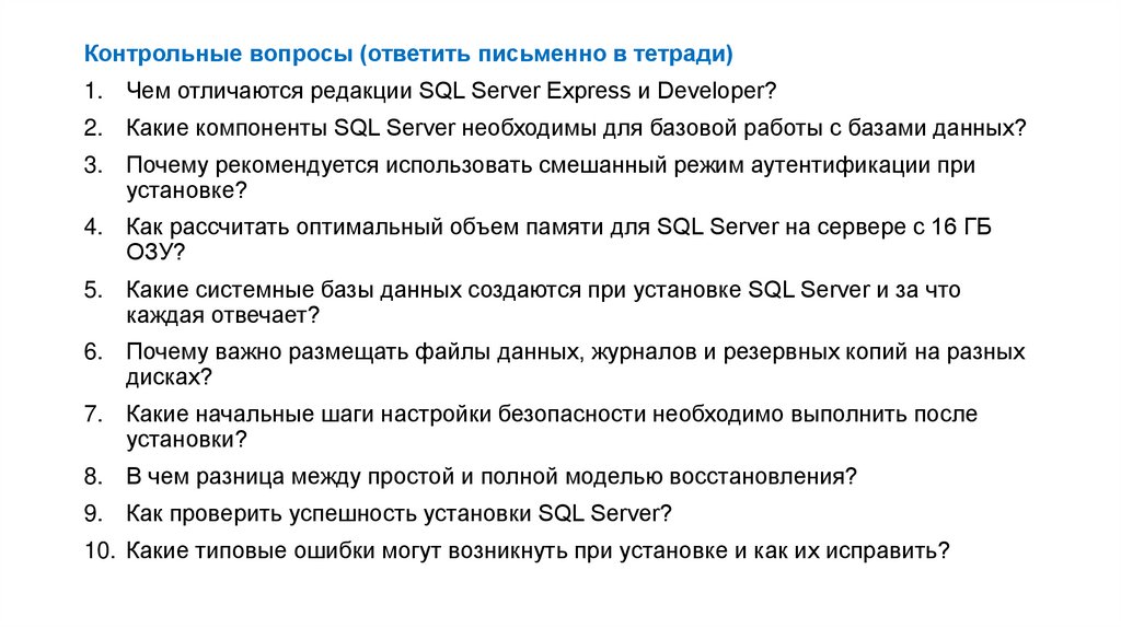 Контрольные вопросы (ответить письменно в тетради)1. Чем отличаются редакции SQL Server Express и Developer?