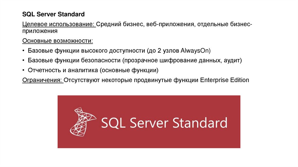 SQL Server StandardЦелевое использование: Средний бизнес, веб-приложения, отдельные бизнесприложения