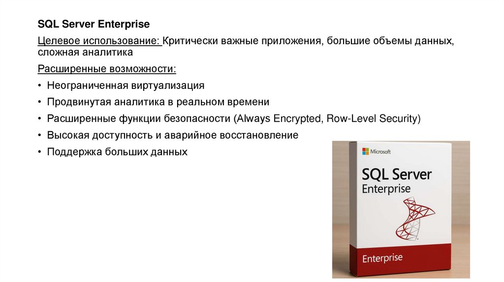 • SQL Server Enterprise — максимальная производительность и доступность
