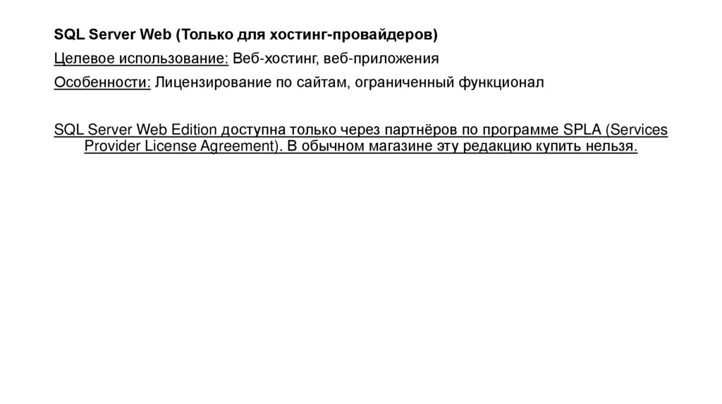 SQL Server Web (Только для хостинг-провайдеров)Целевое использование: Веб-хостинг, веб-приложения