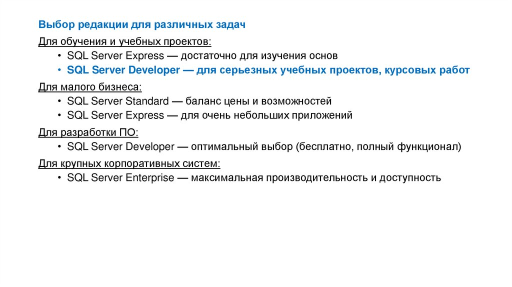 • SQL Server Developer — оптимальный выбор (бесплатно, полный функционал)