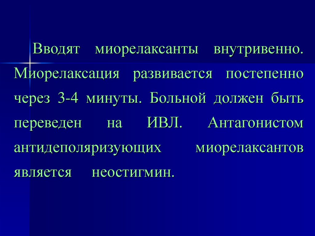 Вводят миорелаксанты внутривенно.Миорелаксация развивается постепенно