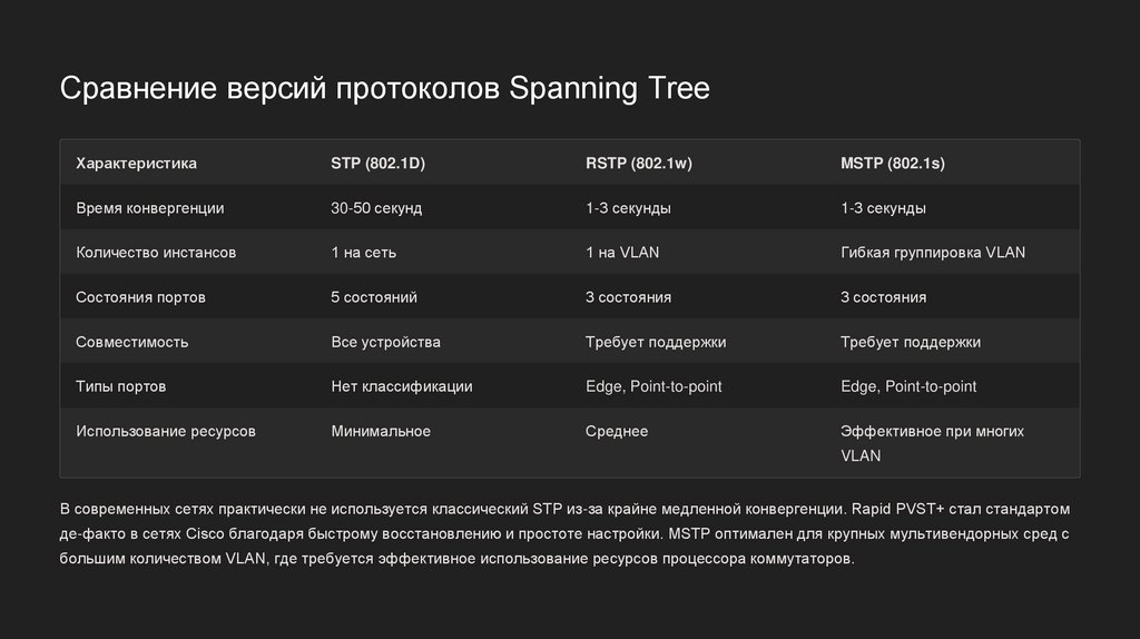 де-факто в сетях Cisco благодаря быстрому восстановлению и простоте настройки. MSTP оптимален для крупных мультивендорных сред с