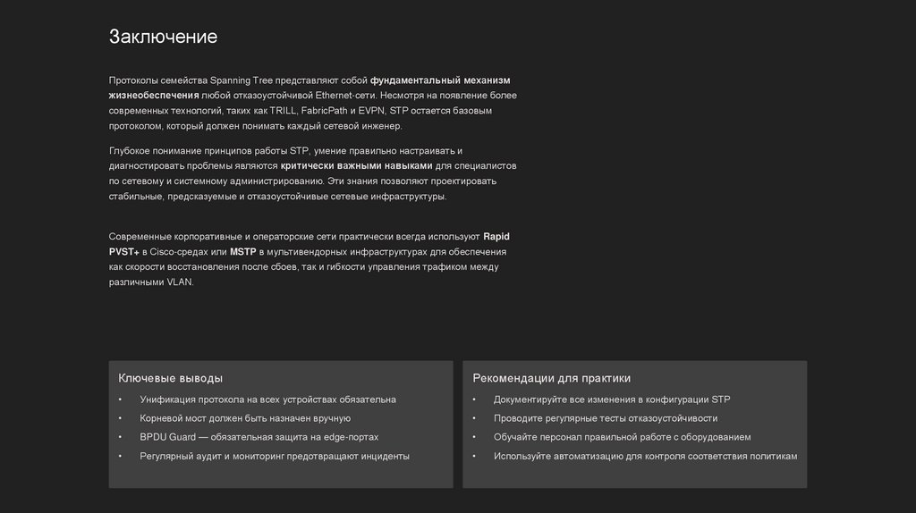 ЗаключениеПротоколы семейства Spanning Tree представляют собой фундаментальный механизм