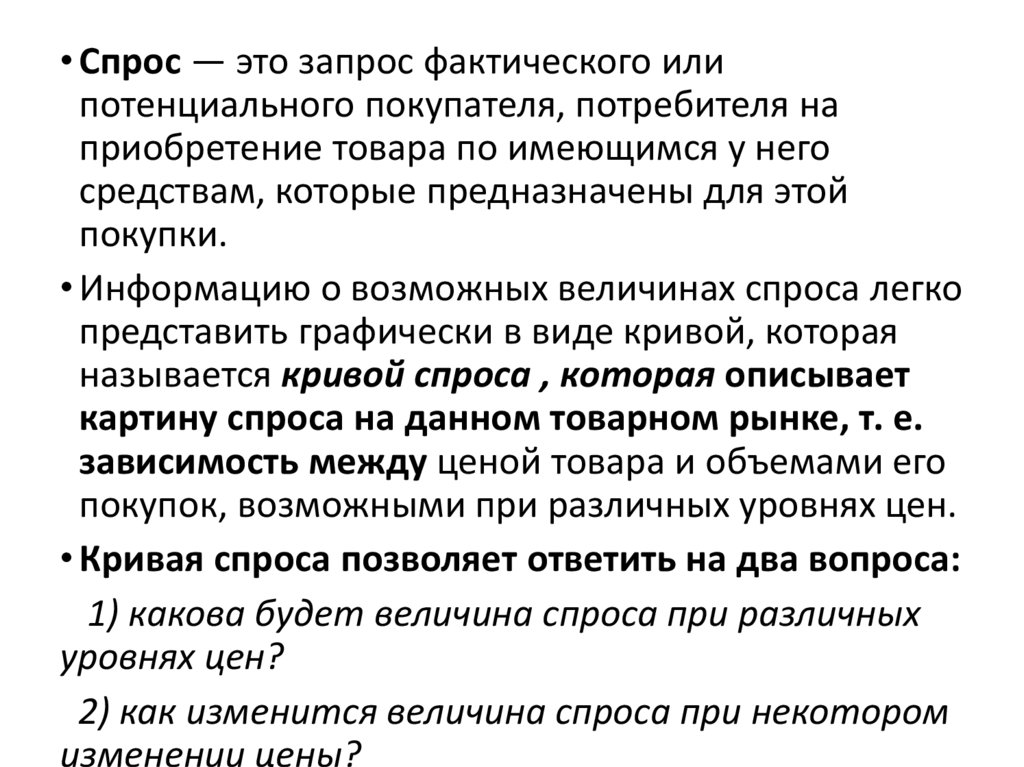 • Спрос — это запрос фактического илипотенциального покупателя, потребителя на