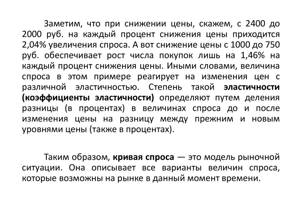 Каждая точка на кривой — величина спроса на данный товар (возможноеколичество покупок) при определенном уровне его цены. Например,