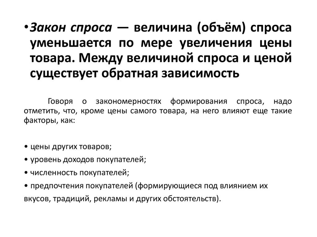 •Закон спроса — величина (объём) спросауменьшается по мере увеличения цены