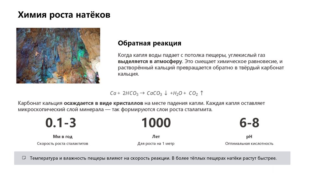 Температура и влажность пещеры влияют на скорость реакции. В более тёплых пещерах натёки растут быстрее.