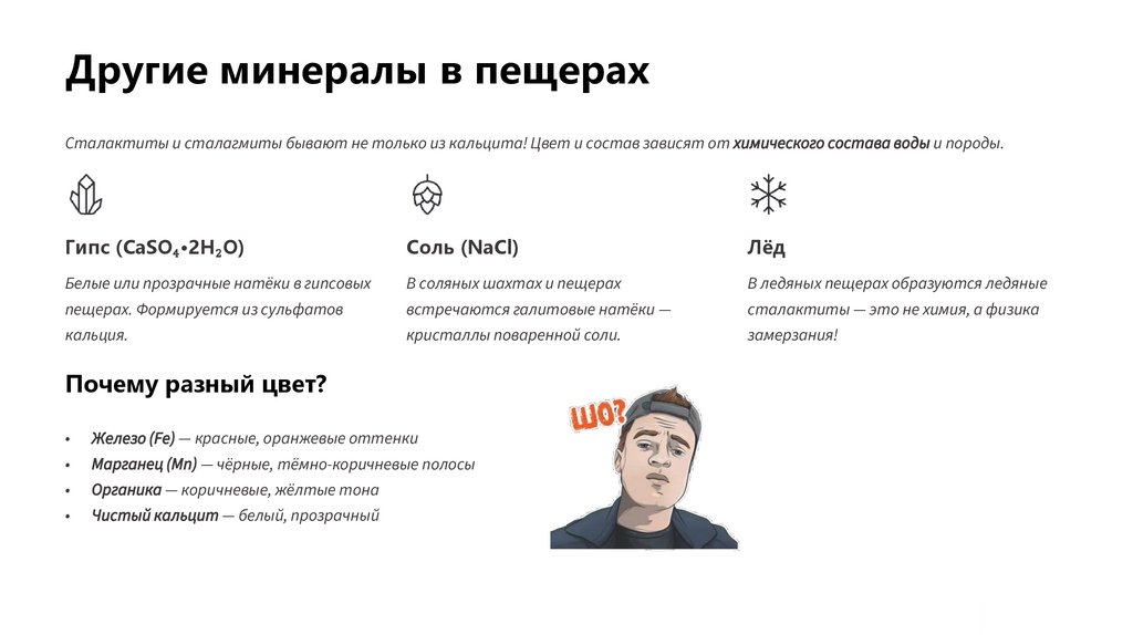 Другие минералы в пещерахСталактиты и сталагмиты бывают не только из кальцита! Цвет и состав зависят от химического состава воды и породы.