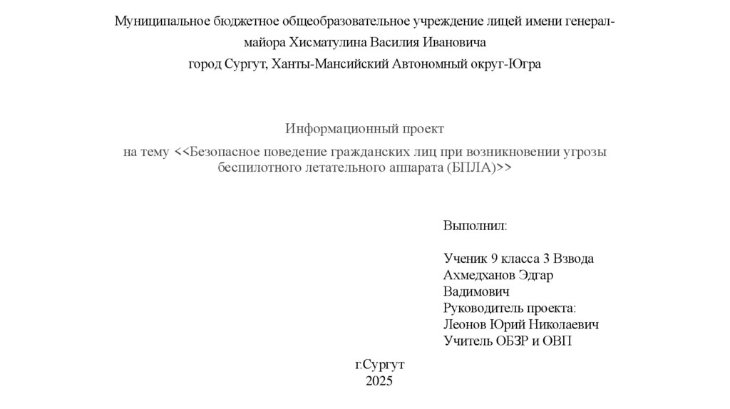 Муниципальное бюджетное общеобразовательное учреждение лицей имени генералмайора Хисматулина Василия Ивановичагород Сургут, Ханты-Мансийский Автономный округ-Югра