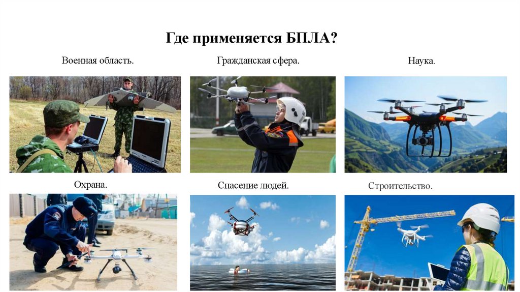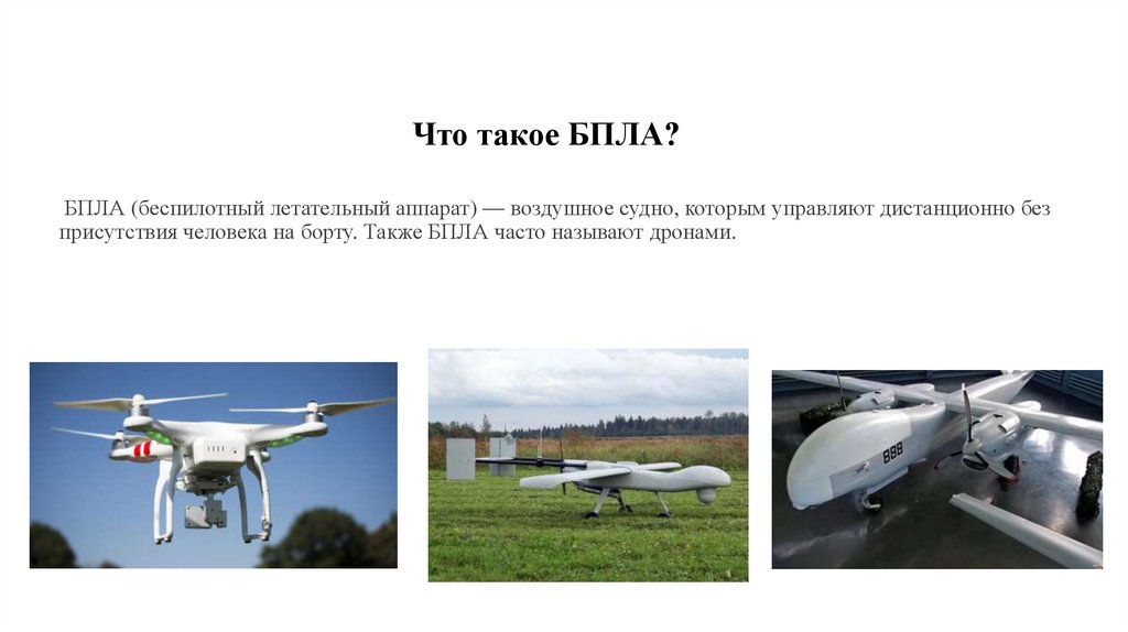 присутствия человека на борту. Также БПЛА часто называют дронами.