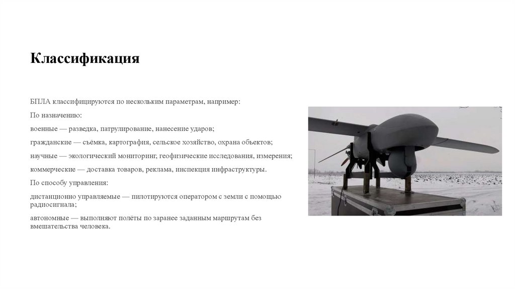 КлассификацияБПЛА классифицируются по нескольким параметрам, например: