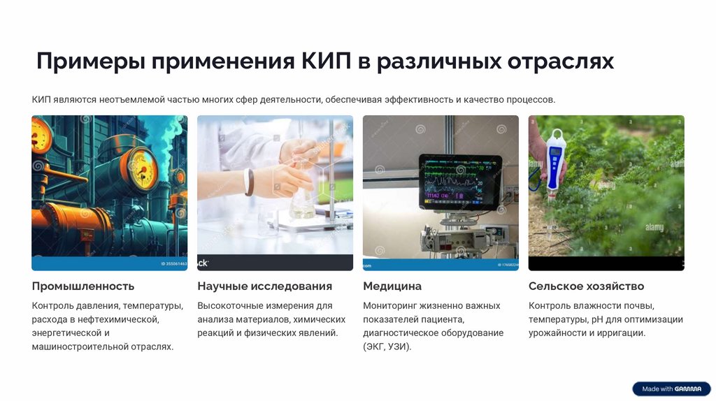 Примеры применения КИП в различных отрасляхКИП являются неотъемлемой частью многих сфер деятельности, обеспечивая эффективность и качество процессов.