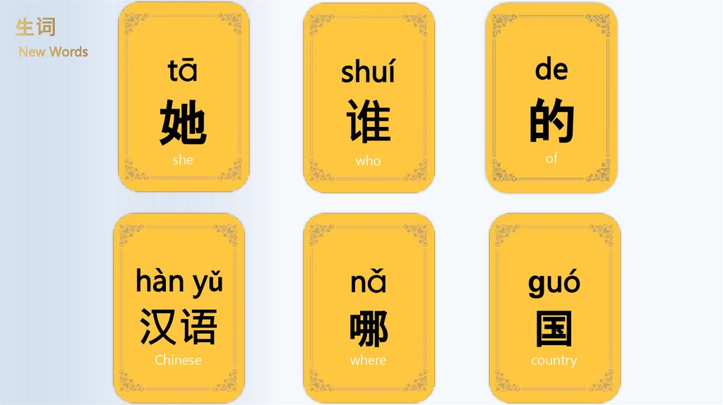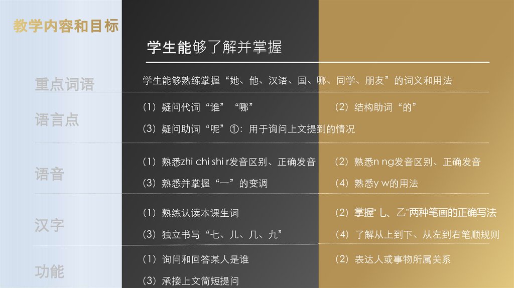 学生能够熟练掌握“她、他、汉语、国、哪、同学、朋友”的词义和用法