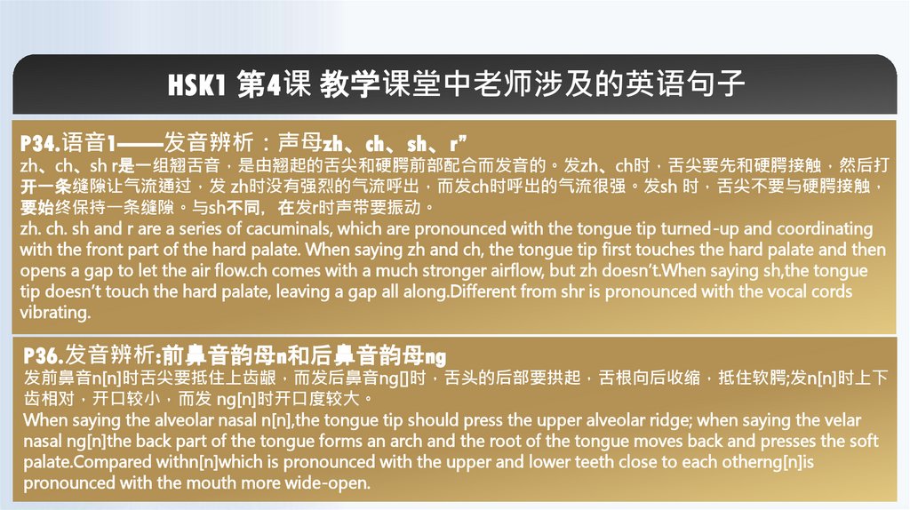 HSK1 第4课 教学课堂中老师涉及的英语句子P34.语音1——发音辨析 声母zh、ch、sh、r”