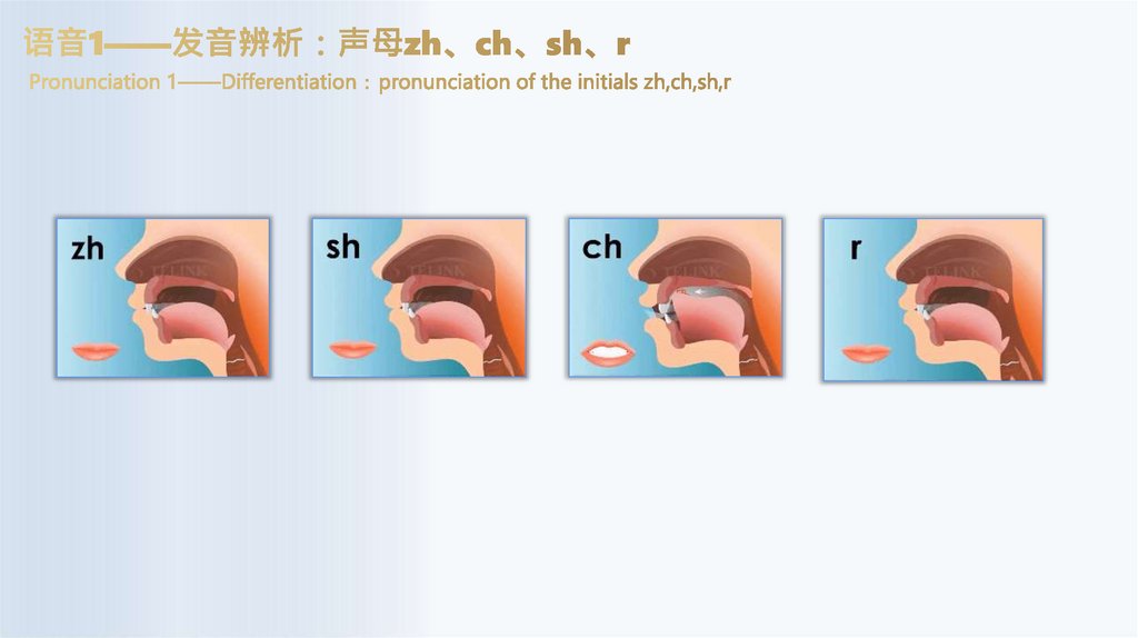 zh、ch、sh r是一组翘舌音 是由翘起的舌尖和硬腭前部配合而发音的。发zh、ch时 舌尖要先和硬腭接触 然后打