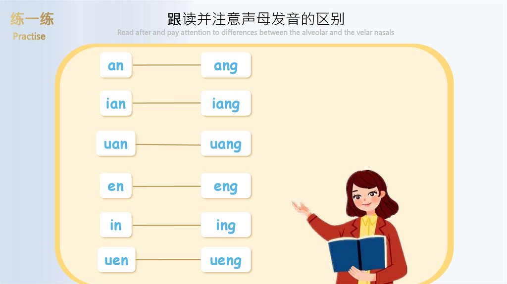 跟读并注意声母发音的区别Read after and pay attention to differences between the alveolar and the velar nasals