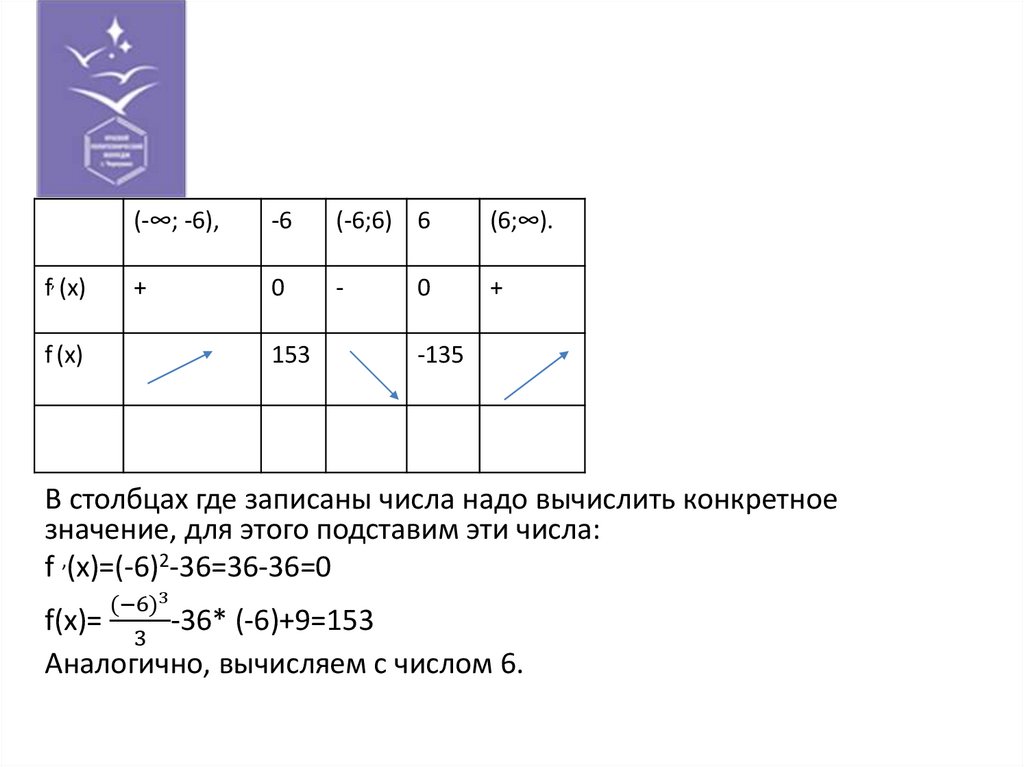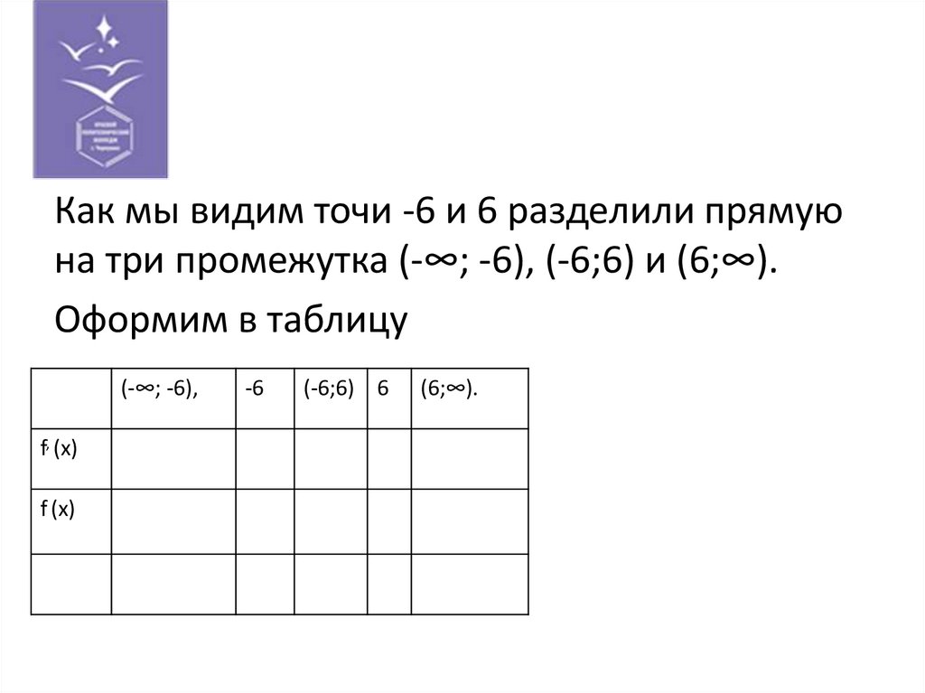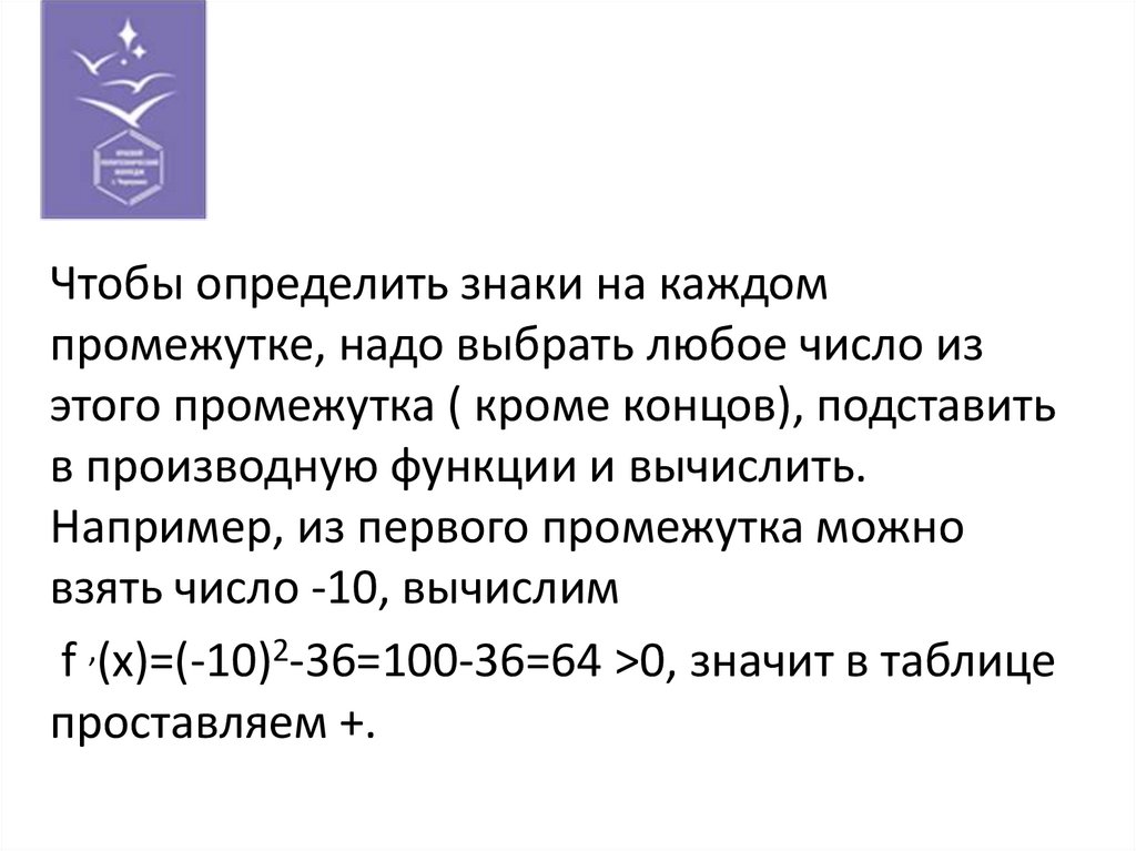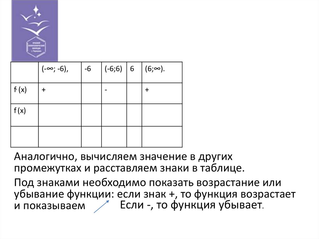 f ,(x)=(-10)2-36=100-36=64 >0, значит в таблице