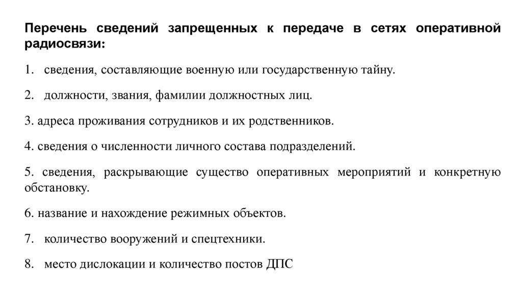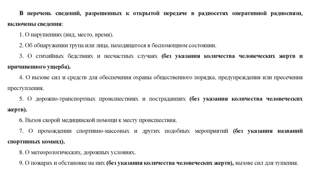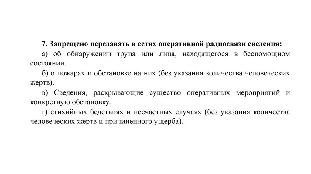 7. Запрещено передавать в сетях оперативной радиосвязи сведения:а) об обнаружении трупа или лица, находящегося в беспомощном