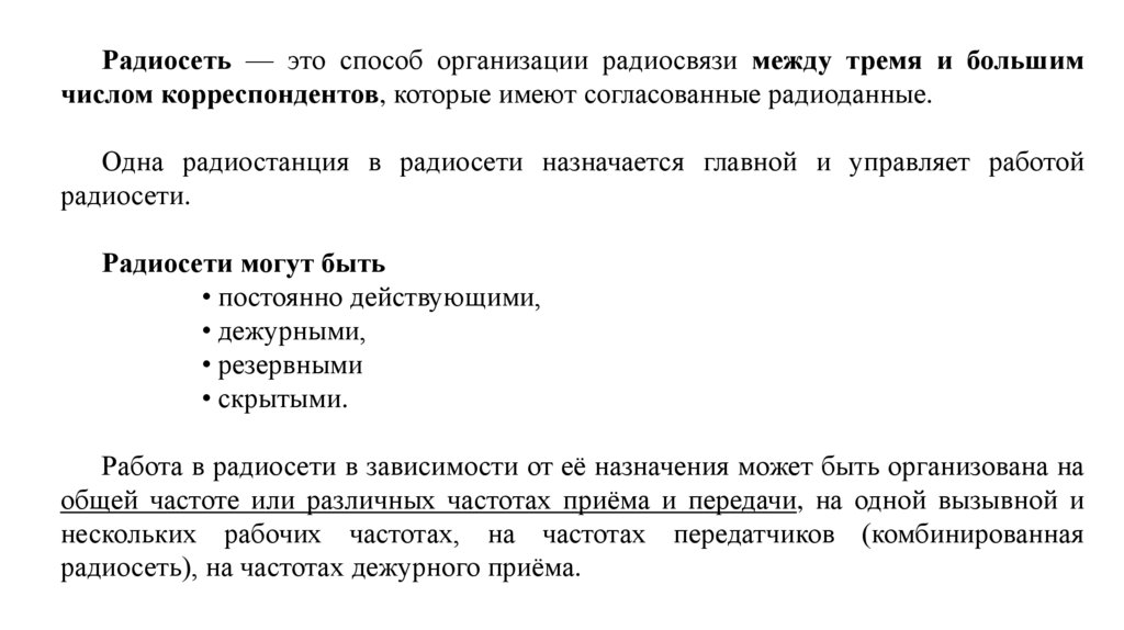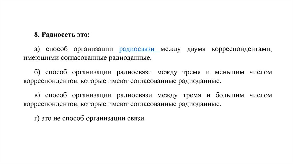 8. Радиосеть это:а) способ организации радиосвязи между двумя корреспондентами,