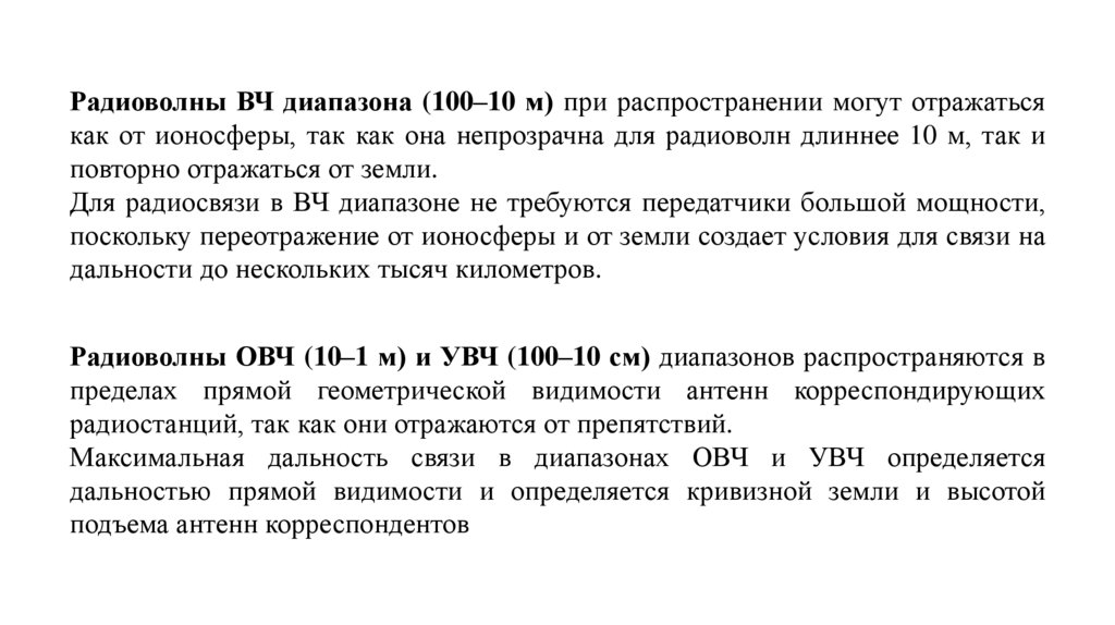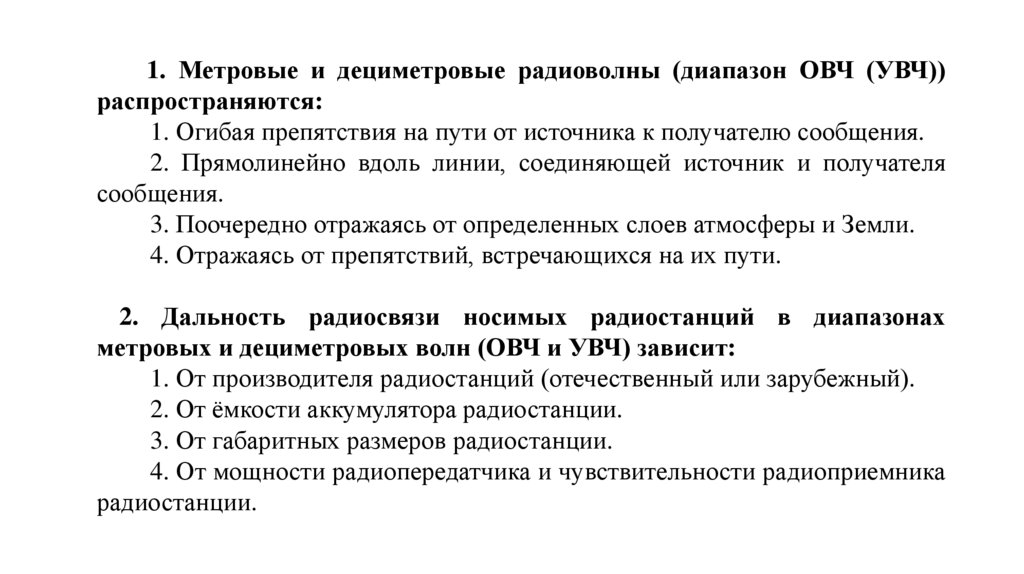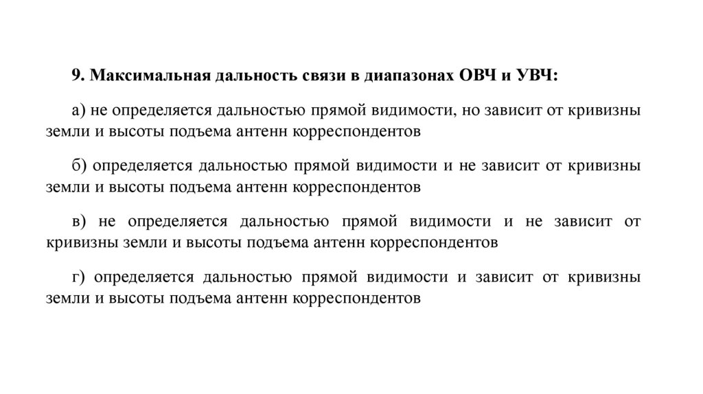 9. Максимальная дальность связи в диапазонах ОВЧ и УВЧ:а) не определяется дальностью прямой видимости, но зависит от кривизны