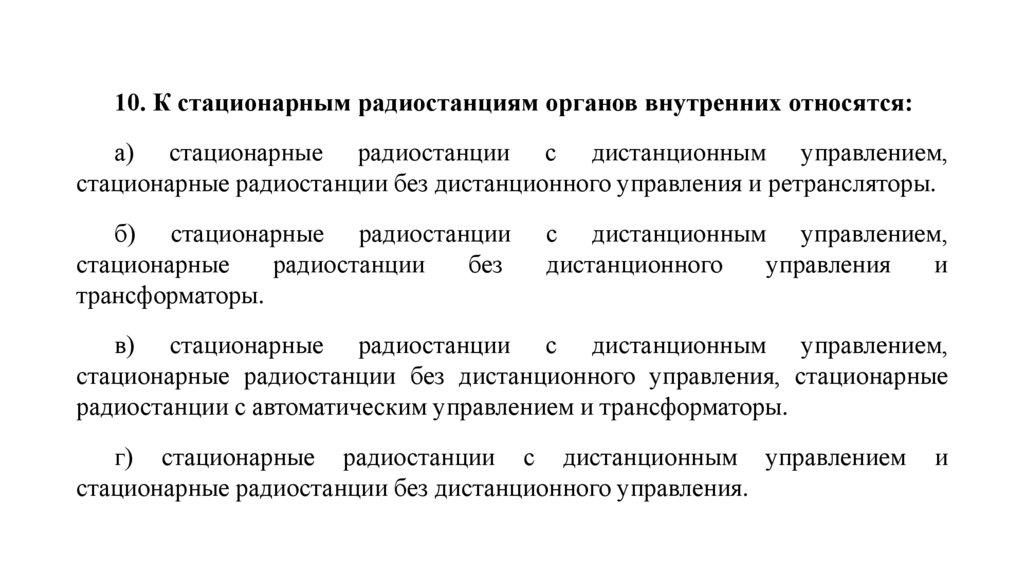 10. К стационарным радиостанциям органов внутренних относятся:а) стационарные радиостанции с дистанционным управлением,