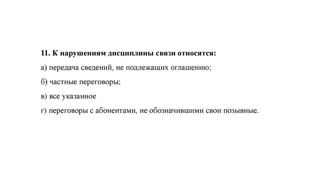 11. К нарушениям дисциплины связи относятся:а) передача сведений, не подлежащих оглашению;