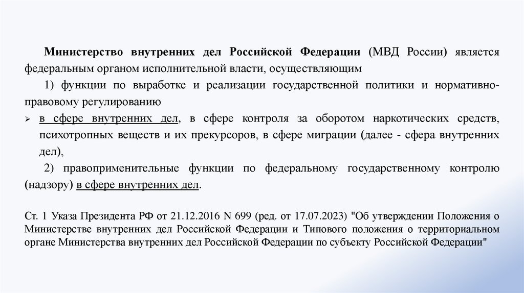 Министерство внутренних дел Российской Федерации (МВД России) являетсяфедеральным органом исполнительной власти, осуществляющим