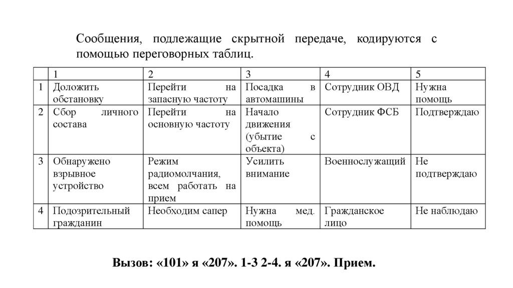 Вызов: «101» я «207». 1-3 2-4. я «207». Прием.