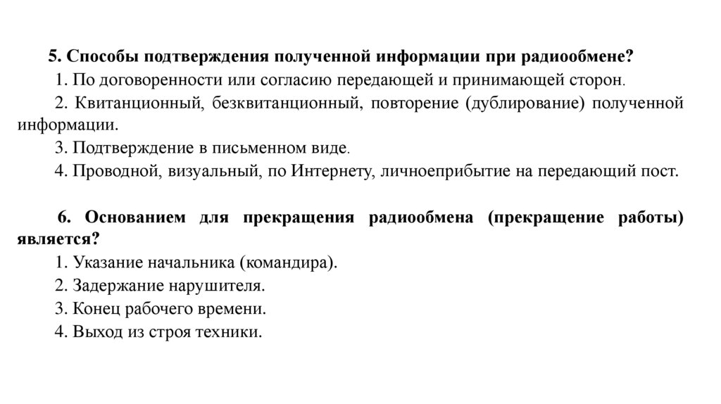 5. Способы подтверждения полученной информации при радиообмене?1. По договоренности или согласию передающей и принимающей сторон.
